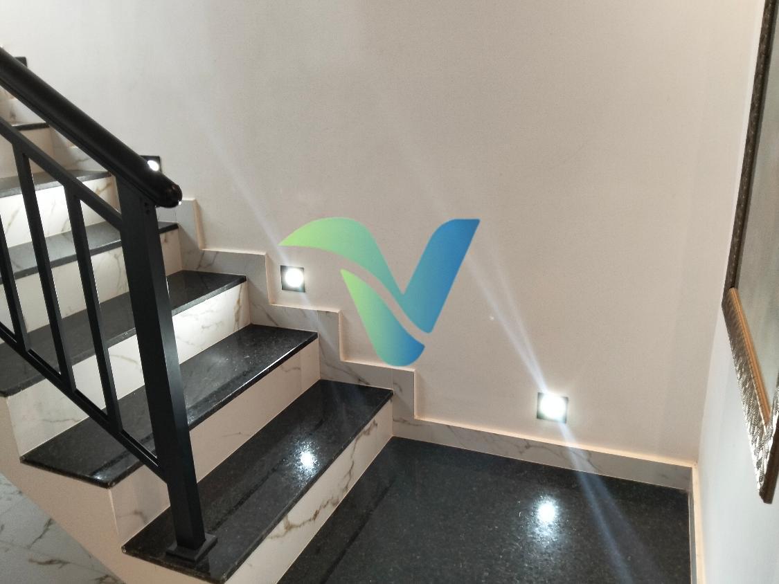 A sala impressiona com pé-direito elevado, acabamento em gesso e projeto de iluminação em LED que valoriza ainda mais o espaço.